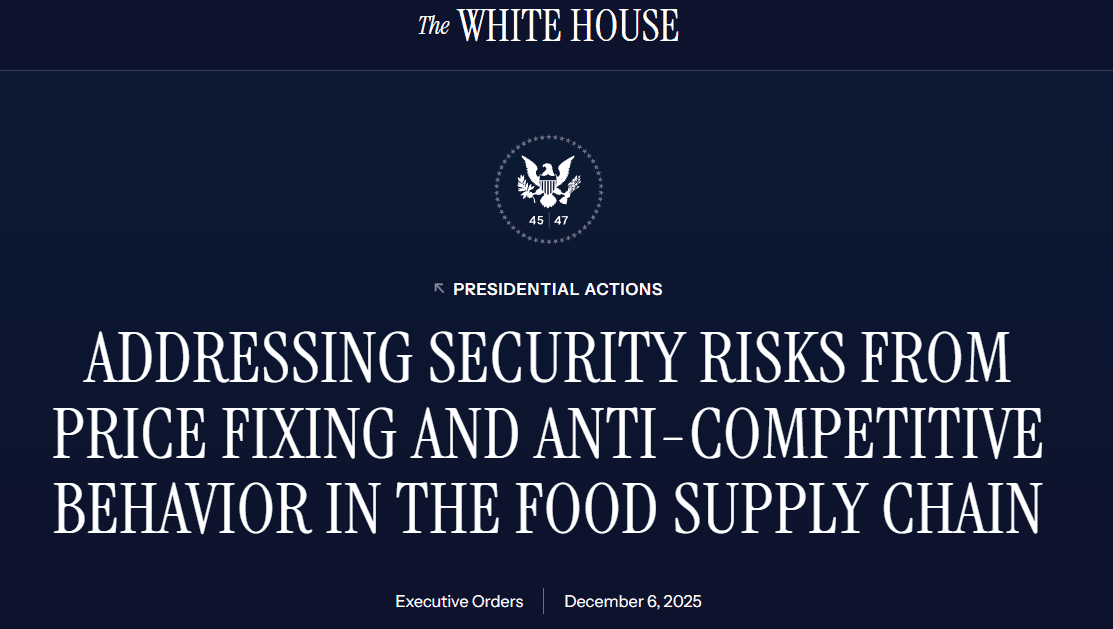 President Donald Trump signed an executive order on December 6, 2025, directing the Justice Department and Federal Trade Commission to establish dedicated task forces to investigate price fixing, anti-competitive practices, and foreign control in the U.S. food supply chain. Titled "Addressing Security Risks from Price Fixing and Anti-Competitive Behavior in the Food Supply Chain," the order frames affordable food as a national and economic security priority, targeting sectors like meat processing, seeds, fertilizer, and equipment where consolidated ownership has driven up costs for American consumers.